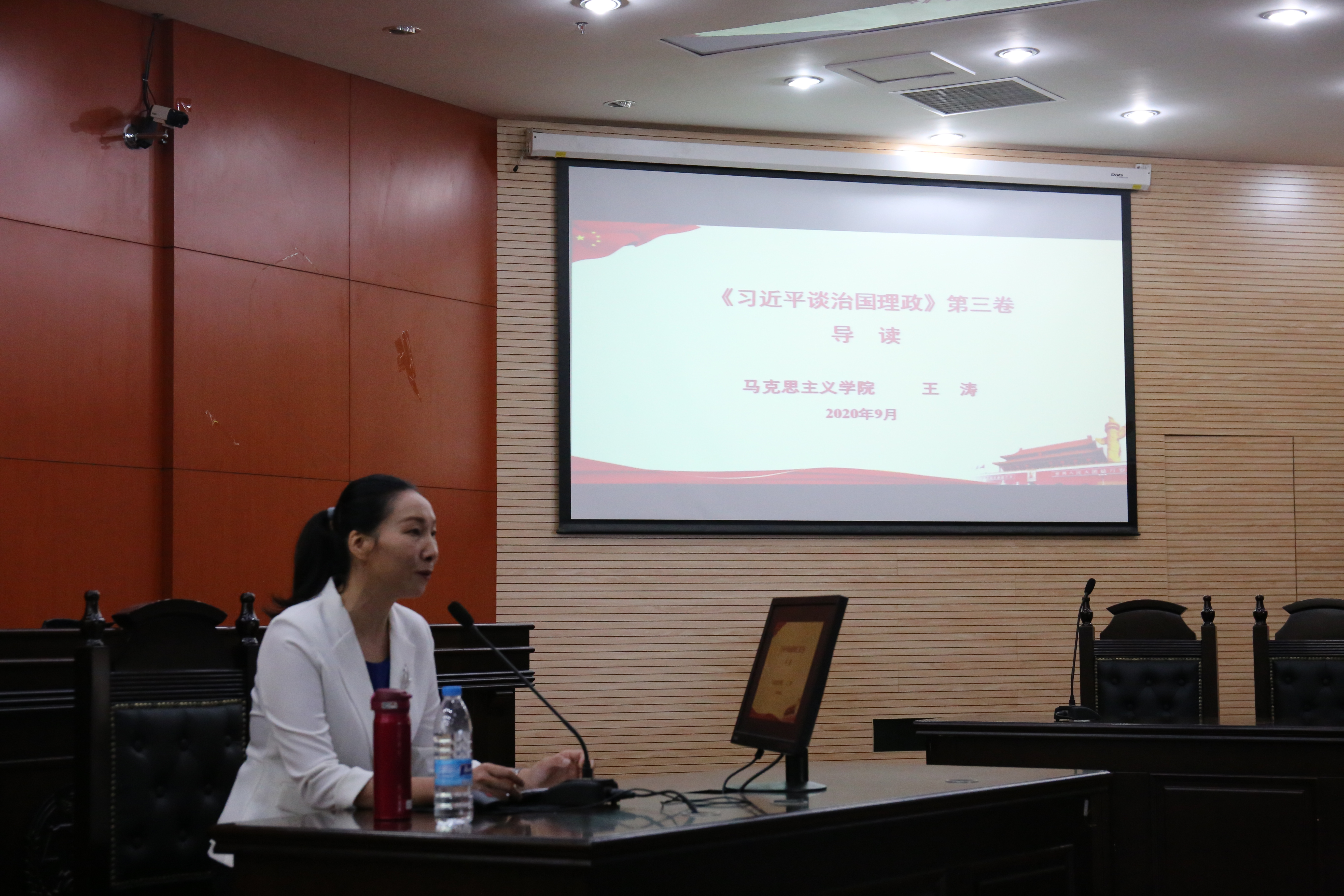 2020年9月22日下午4点,受太阳城 邀请,马克思主义太阳城 王涛老师为全体教师做了《习近平谈治国理政》第三卷导读。讲座在师生活动中心模拟法庭举行,支部党员参加了讲座,并与王涛老师进行了交流。